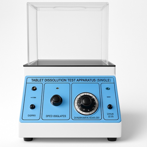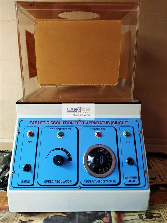 Single blue Labson dissolution test apparatus for pharmacy/laboratory. Features digital timer, counter, and micro-controller based operation. AC power supply, made in India.