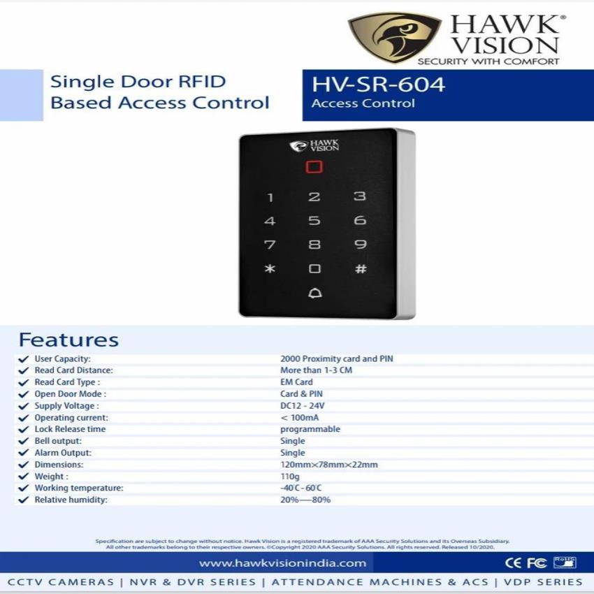 RFID access control machine for single doors. Features include card reader and optional keypad. Model HV-SR-604 provides secure entry management.