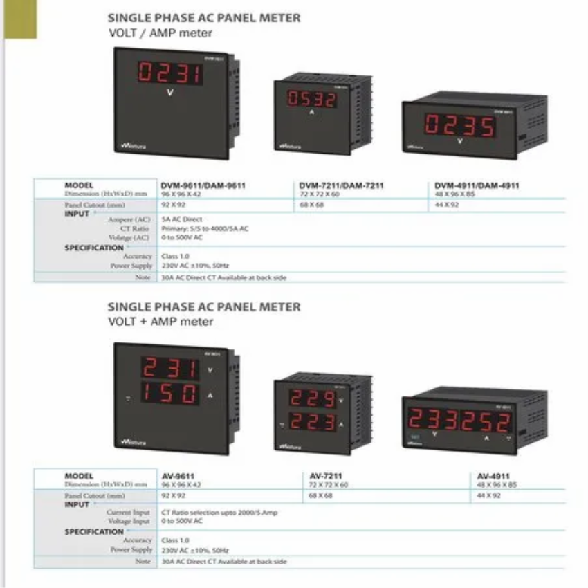 Single phase AC panel meter for measuring both voltage and amperage. Essential for electrical monitoring.