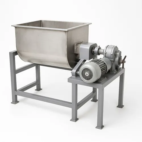 Single phase stainless steel batch mixer. 220V, 50Hz, 2hp motor. 200kg tank capacity. Ideal for industrial mixing. Made in India.