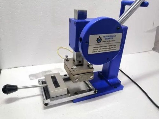Single phase manual blister packing machine for capsule use. 220V, made in India. Occupies approximately 65 cm of floor space.
