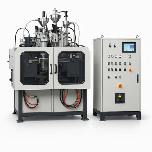 Automatic single-station HDPE bottle making machine for 2-5 liter capacity. Produces bottles from HDPE, LDPE, and PE materials. Operates on 440V electric power.