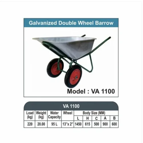 Galvanized Double Wheel Barrow, Model VA-1002, for commercial use. Features a 160 kg load capacity. Made in India and available in stock.