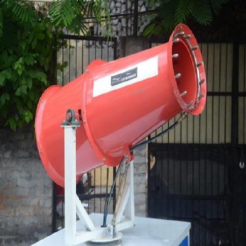 Semi-automatic fogging cannon dust suppression system with metal and plastic construction. Features 360-degree rotation and 0-60 degree elevation, with a 25-30m throw range.