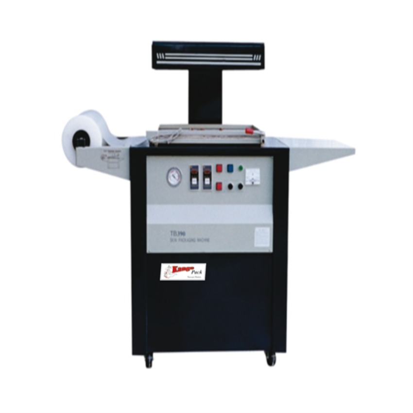 Skin packing machine, Model KS390, capable of 50-60 packages/hour. Features 5.5W total power and 150 Kg weight, dimensions 920x620x1220mm.