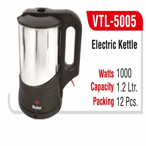 Skyline 1.2L electric kettle made of stainless steel. Features auto switch-off, boil-only temperature control, and 1200W power. ISI Certified for safety and quality assurance.