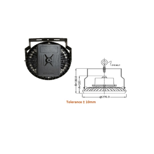 90W LED high bay light with 5700K color temperature and >9000 lm output. Features IP65 rating and 240V input for warehouse use.