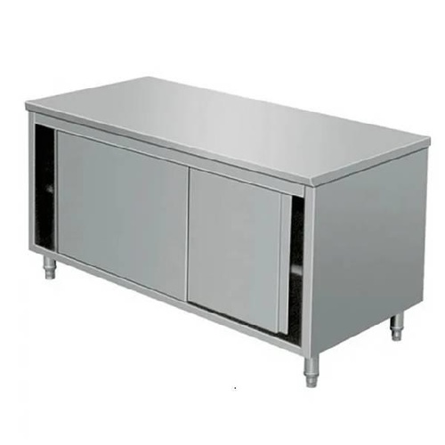 Durable work counter featuring a sliding door for practical storage and workspace organization. Ideal for various professional environments.