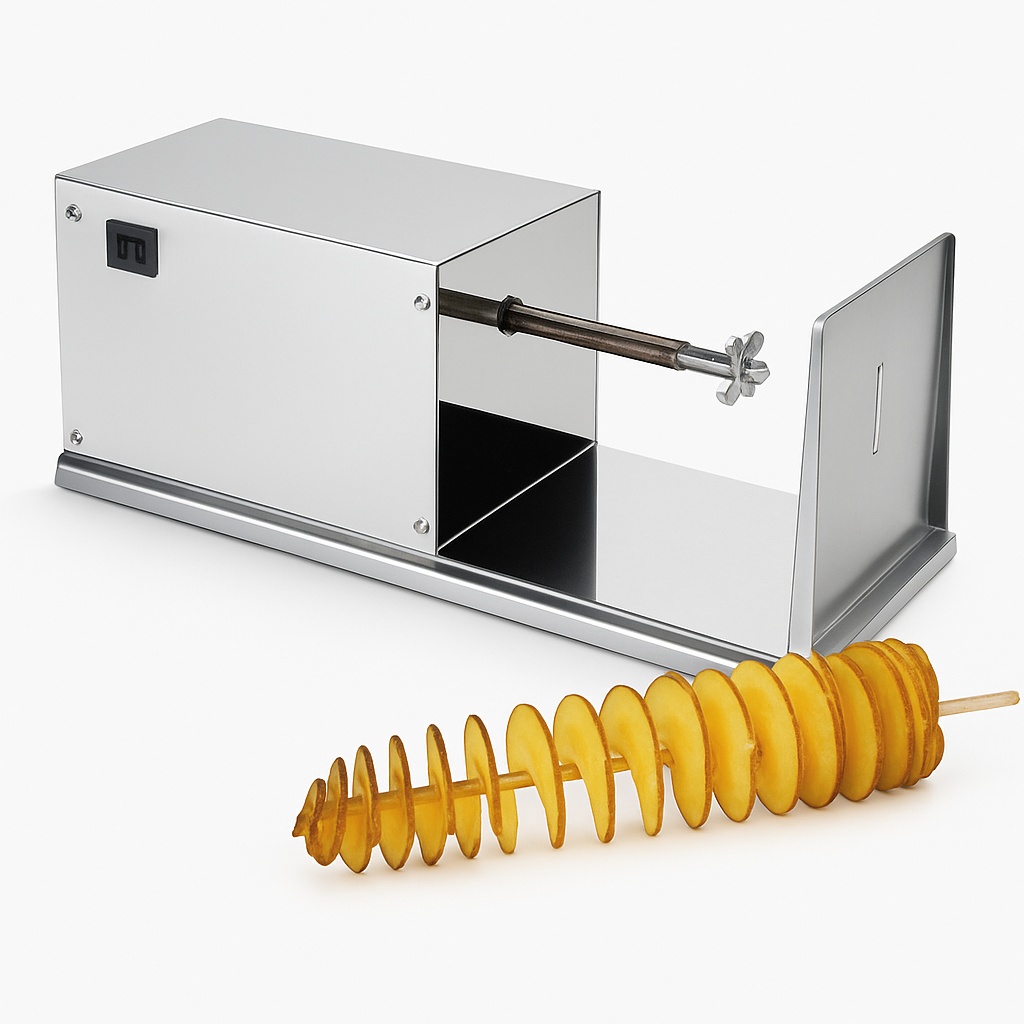 Electric spring potato cutter made from durable stainless steel. Features a steel finish for professional kitchen use. Efficiently creates spiral potato chips.