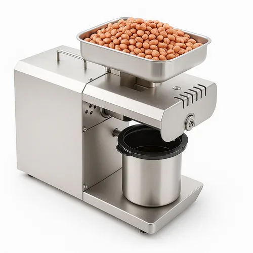 Automatic stainless steel oil maker machine, model SI-400W. Compact design with 400W power, ideal for domestic and home use, capacity 2-4 kg/hr.