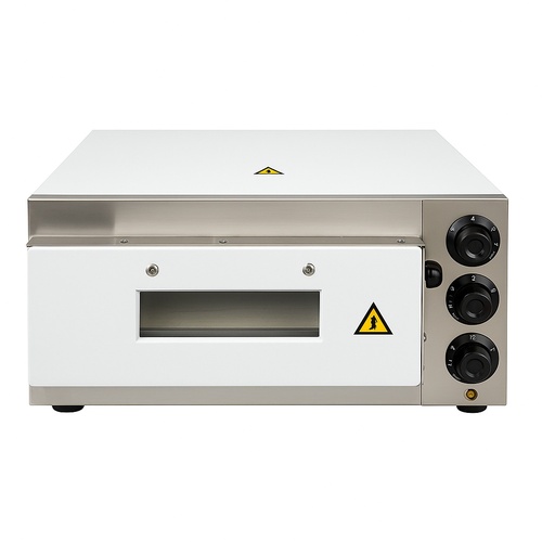 Stainless steel electric pizza oven, small/mini size for bakery use. Semi-automatic operation, single door, with a maximum temperature of 200°C.