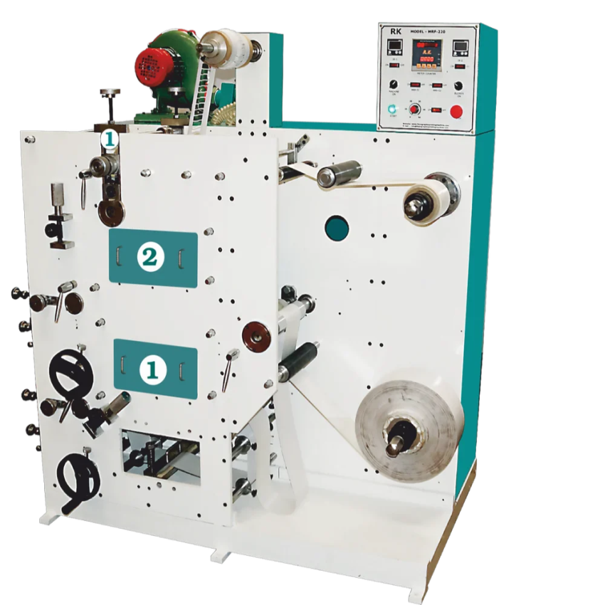 Indian-made flexo label printing machine. Prints at over 3000 mm/min with 2 colors. Max label width 200 mm, length over 100 mm.