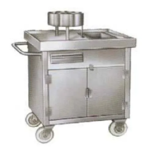 Stainless steel snack trolley with rectangular shape. Supports 50-120 kg capacity. Polished finish for hygienic and efficient snack presentation.