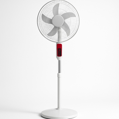 Solar-powered pedestal fan with 5 blades. Features 90-degree oscillation and a rotable head for wide air distribution. Designed for efficient, eco-friendly cooling.