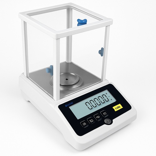 Laboratory analytical semi-micro balance with 120gm capacity, 0.0001g readability, and 0.0002g repeatability. Features internal calibration and RS-232 interface.
