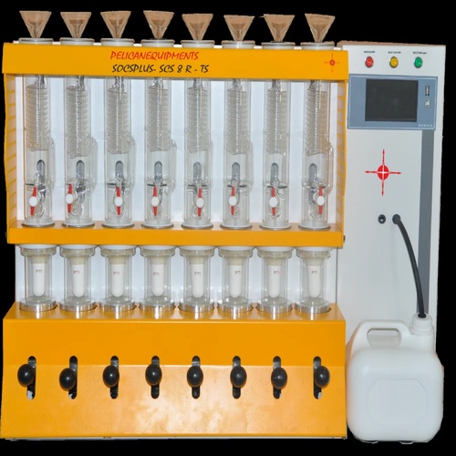 Finished Soxhlet extraction machine, M.S. or S.S. material, yellow color. Polished finish, made in India. Designed for effective extraction processes in lab settings.