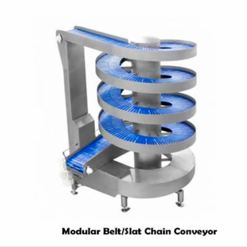 Mild steel spiral conveyor with stainless steel rollers. Belt widths: 380mm (Slat Chain), 400-800mm (Modular), 300-800mm (Gravity Roller). Made in India.