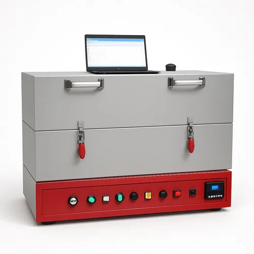 Split tube furnace with 220V AC power. Operates at 1350°C max and 800°C range with +/- 1°C accuracy. Features replaceable silicon carbide heating elements.