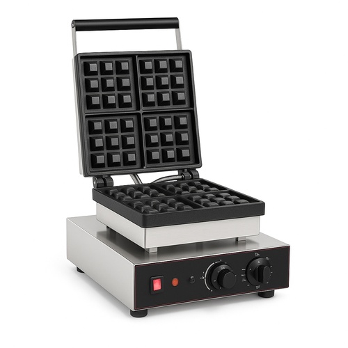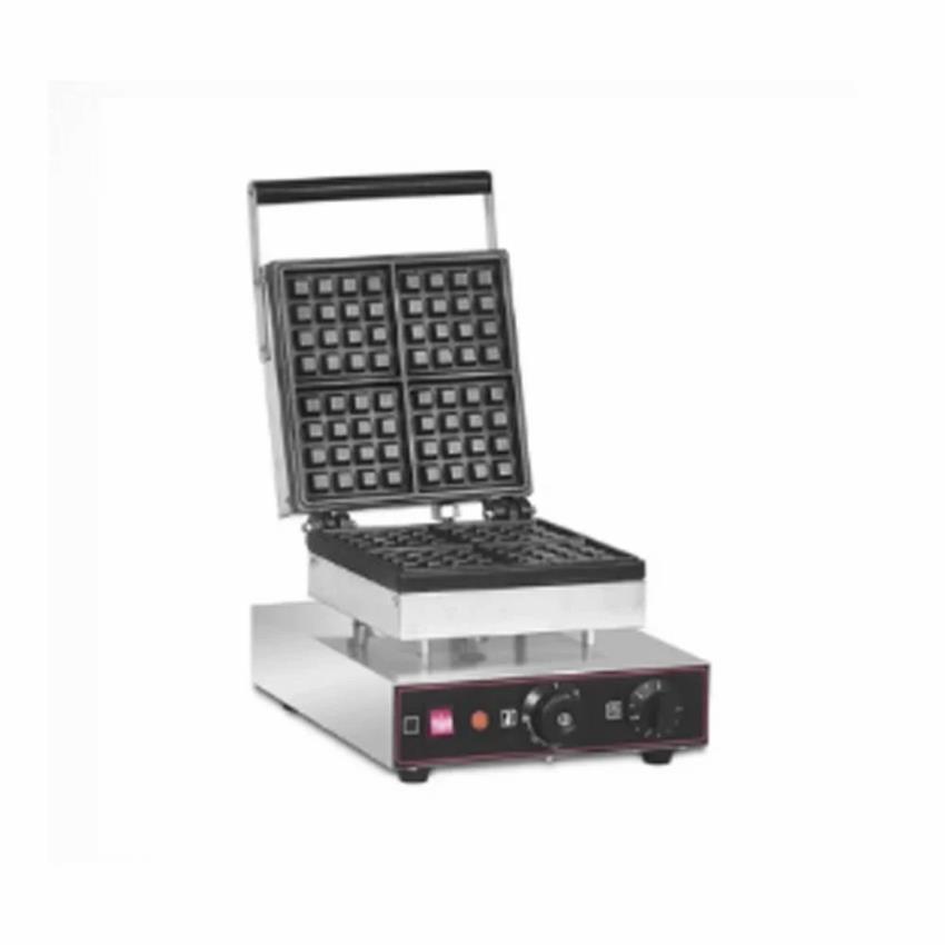 ISI certified electric waffle baker in silver and black. Made in India with a stainless steel body, designed for kitchen use and operates on 120V.
