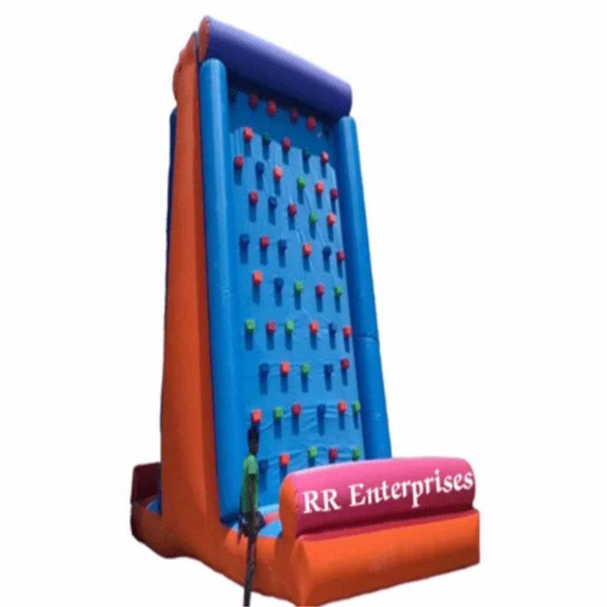 Large inflatable climbing wall, 15x20 ft, with a 3-4 ft climbing surface. Supports 100-150kg, ideal for events and parks for ages 10-15.