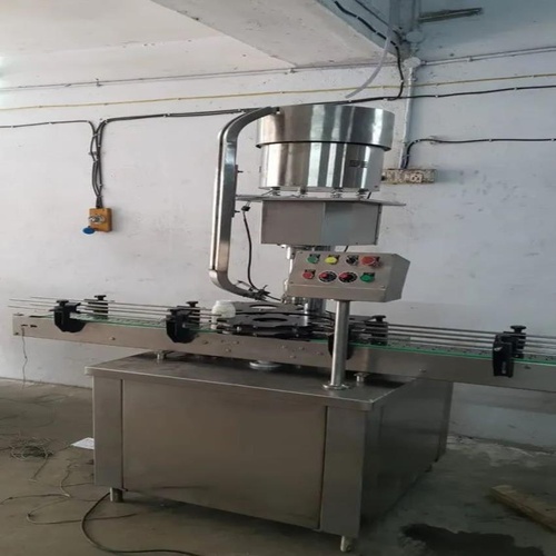 SS automatic bottle screw capping equipment. Model Sri Pack2021 with one head. Capacity: 40 bpm or 1500 bottles/hour. Weight: 500kg. Packaged to GMP standards.
