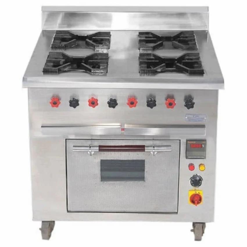 Four burner gas cooking range with oven. Constructed from SS material, ideal for kitchen use. Features semi-automatic machine grade and standard SS finishing.
