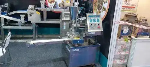 Commercial fully automatic momo making machine. Constructed from SS, it operates on 220V with a capacity of 2000 pieces per hour and 3 units/hr power consumption.