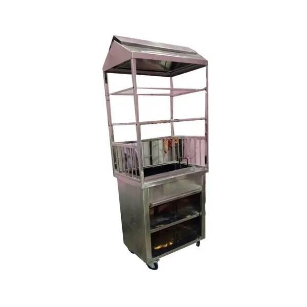 Rectangular stainless steel barbeque display counter. Features two shelves and a 4-foot height. Ideal for barbeque applications. Silver finish.