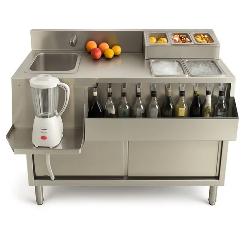 SS cocktail station with cooling system and chrome finish. Rust-proof, features 4 legs. Made in India.