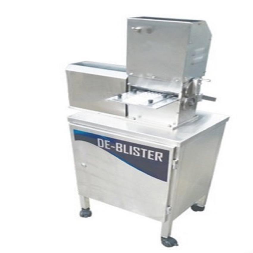 SS De Blister Equipment with SS304 body. Features tablet retention in SS tray, 160mm format area, and AC synchronous motor. Operates at max 15 RPM.