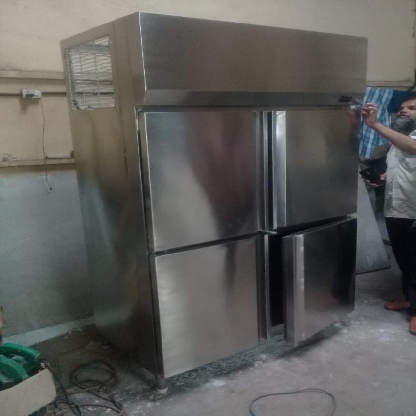 Stainless steel commercial refrigerator with 4 metal doors. Features a capacity range of 100-250 liters, suitable for various business needs. Durable construction ensures longevity.