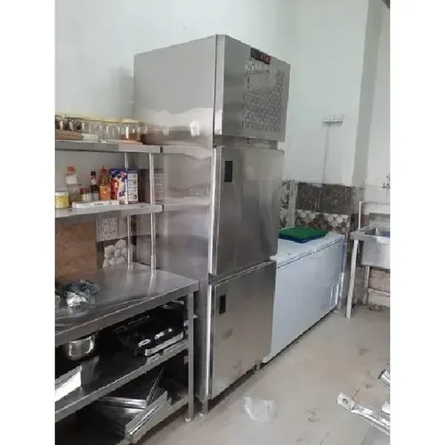 600 liters capacity double door refrigerator made of stainless steel. Features a 1-year warranty. Suitable for commercial storage needs.