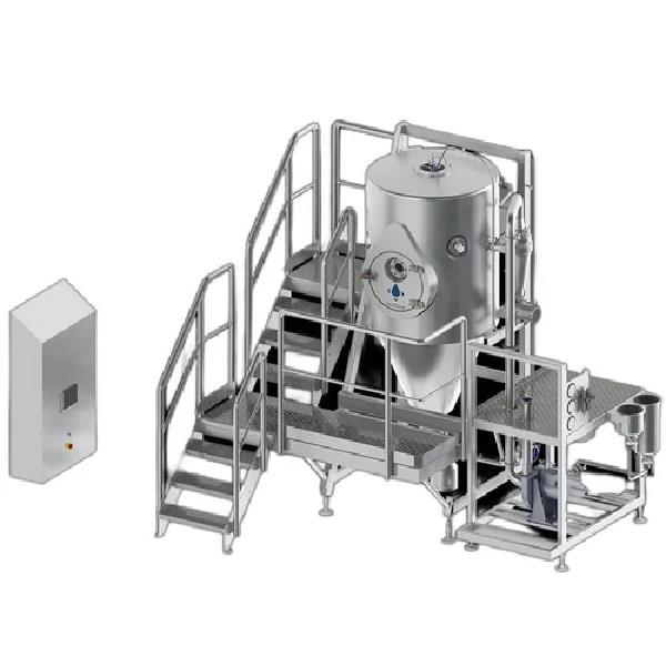 Automatic SS spray dryer for food, chemical, pharma, and industrial applications. Operates on 220V-440V, 3-phase power. Features polished surface finish and treatment.