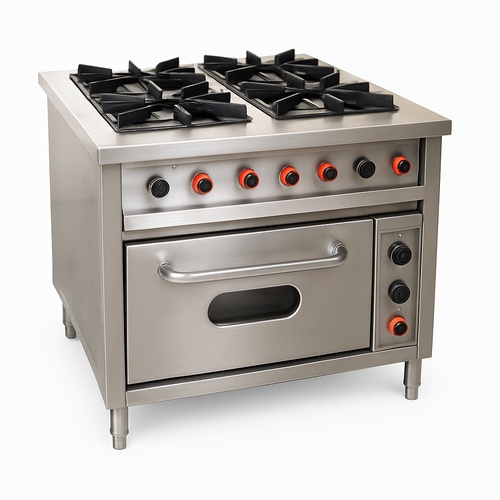 Stainless steel four-burner gas range equipped with an oven. Designed for commercial cooking applications, providing efficient and reliable performance.