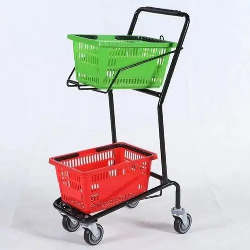 Stainless Steel mopping trolley featuring a basket. Designed for supermarket application, with a 100 kg loading capacity and 3 feet height. Made in India.