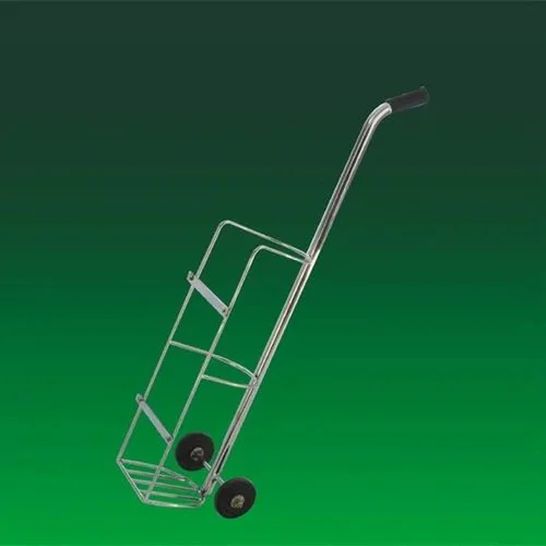 SS-202 stainless steel oxygen trolley. Dimensions: 38" length, 13" width, 10" depth. Designed for secure oxygen cylinder transport.