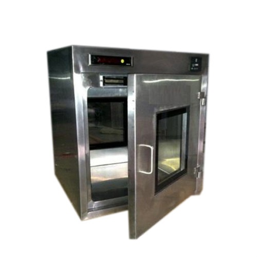 Static pass box for pharmaceutical industry use. Constructed from SS.304/316 material with PVC coated finishing. Operates on 110-220V, 50Hz, single-phase power.