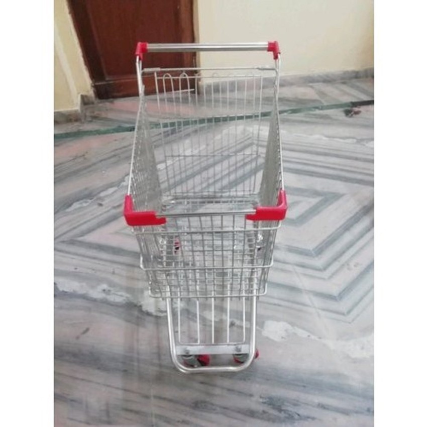 SS shopping cart for commercial use, 2 ft height, 20 kg load capacity. Features polished surface finish and 2-year warranty. Ideal for retail environments.