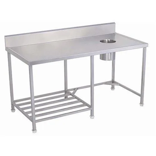 SS304 grade stainless steel dish landing table, 4.5 ft long, 3 ft high, with tube shape legs. Rectangular, powder-coated surface, weighing 25 Kg. Designed for restaurant applications.