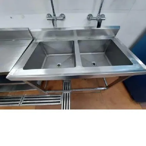 Stainless steel two sink unit. Durable construction for commercial applications. Ideal for efficient kitchen workflow.