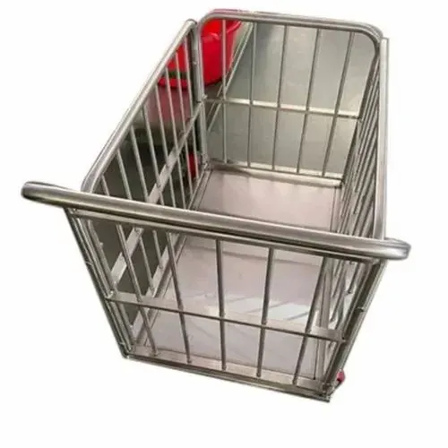 Rectangular stainless steel mesh trolley for restaurants. Polished silver finish, 3-4 feet height. Made in India.