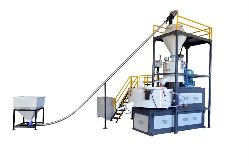 Stainless steel vertical plastic mixer, 50 Hz, with a 90 kg batch capacity. Customized design manufactured in India.