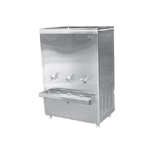 Stainless steel water dispenser cooler with 150 L storage capacity and 10 L/Hr cooling capacity at 16.5 Deg C.