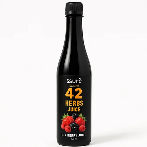 Organic SSURE Natural Super 42 Mix Berry Nectar, dark brown in color, features a natural flavor. Packaged in a 500ml PET bottle with an 18-month shelf life.