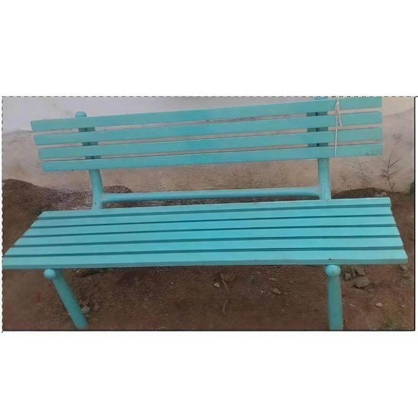 Four seater cast iron garden bench in blue. Features a color-coated surface finish for enhanced durability. Designed without a backrest for an open aesthetic.