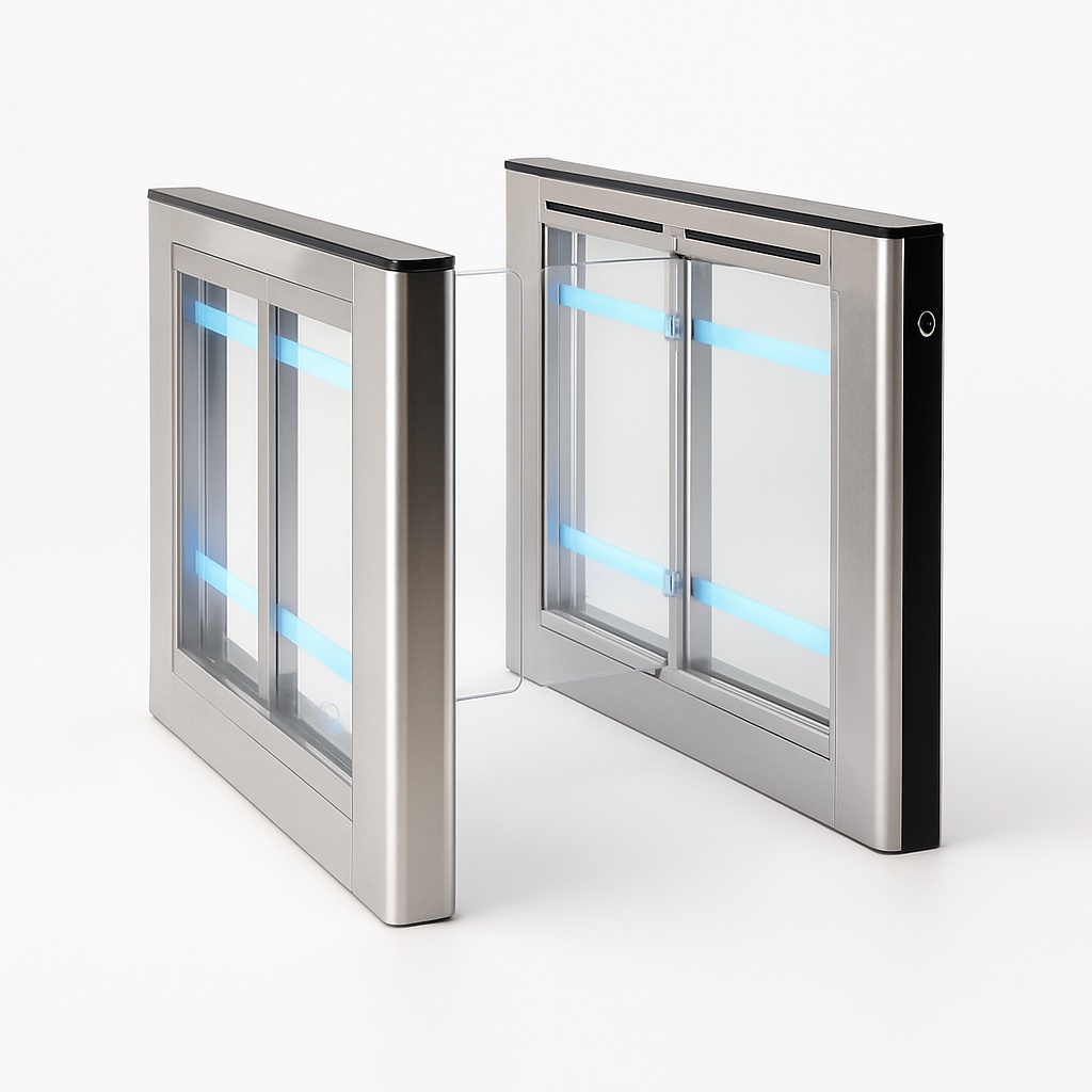 ST-606 Neptune Flap Barrier with retractable, automatic opening. Constructed from durable stainless steel, offering single pass (550mm) or two-pass (1520mm) width configurations. Reliable access control equipment.