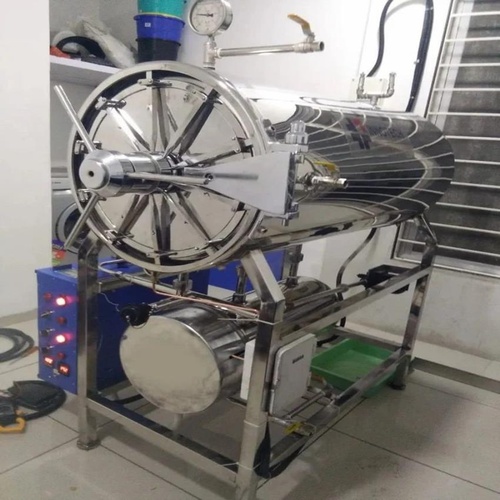 Stainless steel horizontal autoclave. Operates on 240V, 50Hz, single-phase electric power. Made in India for reliable sterilization in various settings.