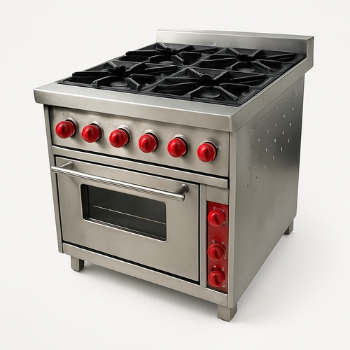 Polished stainless steel commercial cooking range featuring 4 burners and 6 control knobs. Square shape for efficient kitchen integration.