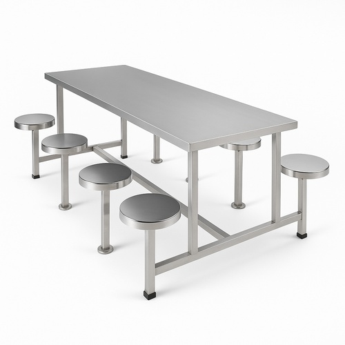 Rectangular stainless steel dining table, 6-seater capacity. Includes stools. Made with SS Grade 304 steel, featuring a natural steel finish for canteen use.