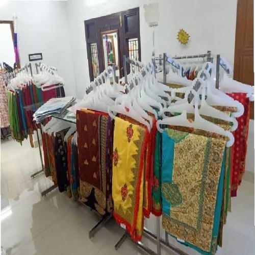 Polished SS 202 grade stainless steel free-standing unit for supermarket garment display. Efficient 6-way hanging system designed for optimal organization and presentation.